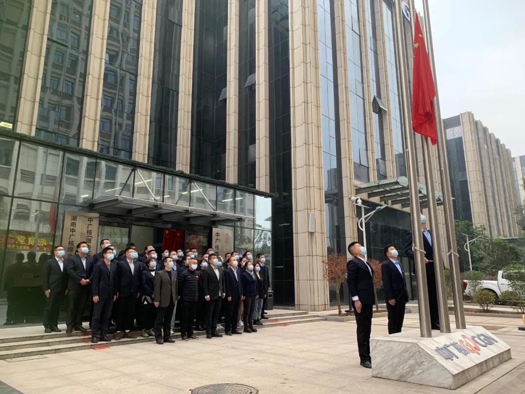 ▲中國(guó)廣核新能源控股有限公司湖南分公司在長(zhǎng)沙辦公大樓前坪舉行升旗儀式