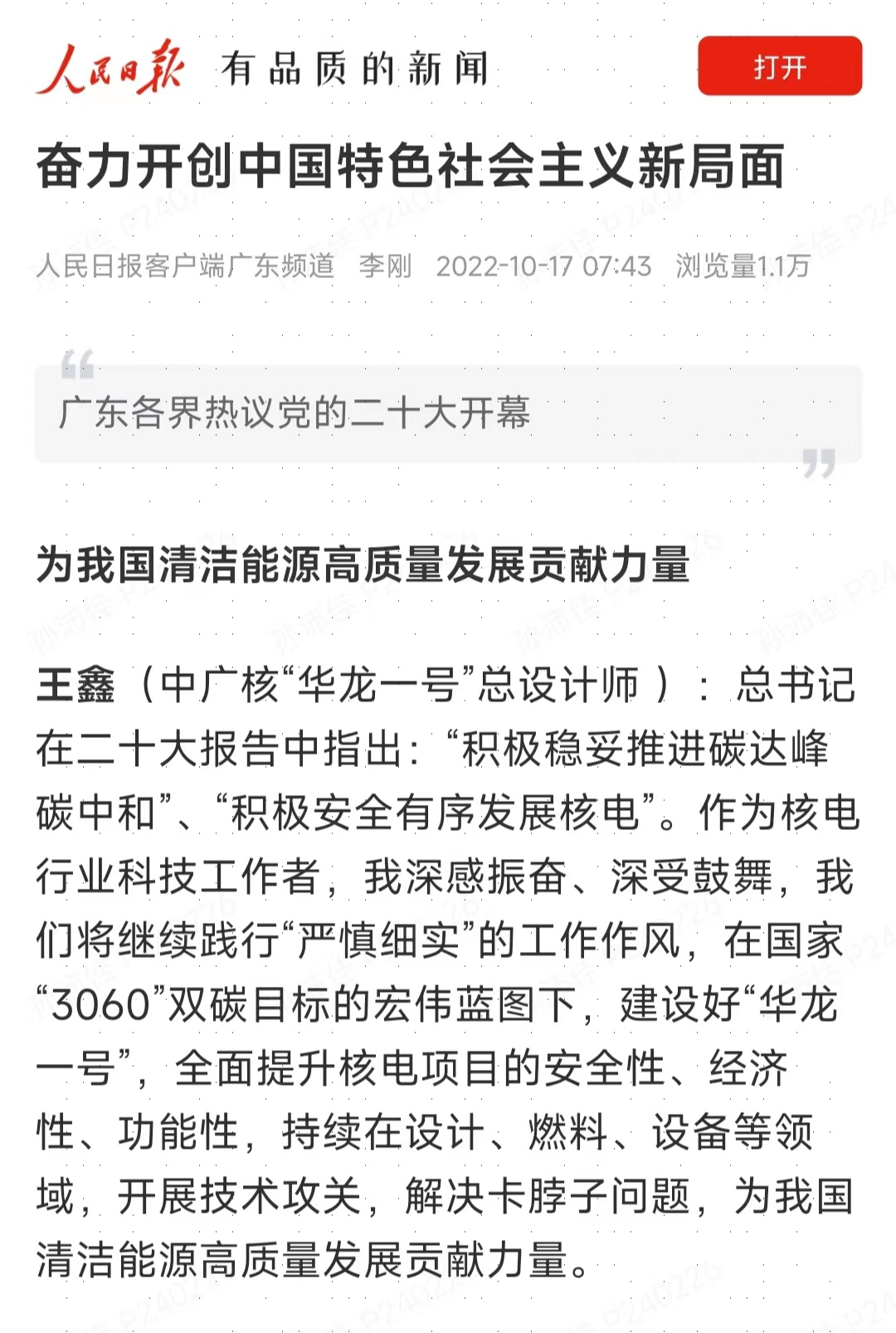 習近平總書記的報告氣勢恢宏、催人奮進,充分體現(xiàn)百年大黨的歷史主動精神和責任擔當,是新時代指引全黨在全面建設社會主義現(xiàn)代化國家新征程上接續(xù)奮斗的綱領性文件。作為核能事業(yè)工作者,我們一定認真學習貫徹落實好黨的二十大精神,胸懷“國之大者”,做到“兩個維護”,深入踐行“嚴慎細實”工作作風,牢牢守住核安全底線,不負時代召喚和使命擔當,奮力開拓中廣核核能事業(yè)高質(zhì)量發(fā)展的新局面,為全面建設社會主義現(xiàn)代化國家作出新貢獻!