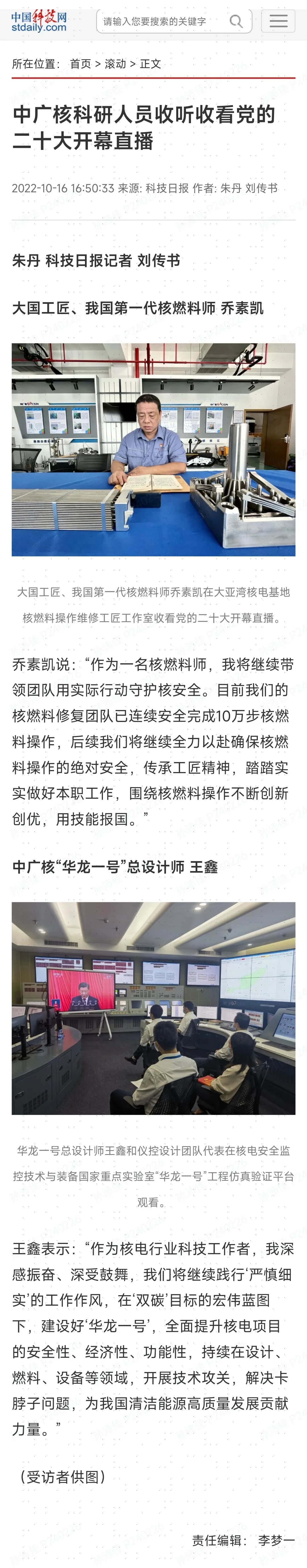 全黨全國人民期盼已久的黨的二十大隆重召開,我認真聆聽了習近平總書記的報告,倍受鼓舞、倍感振奮。作為中廣核科技管理部門的一員,接下來我將深入學習貫徹落實好黨的二十大精神和習近平總書記關于科技創(chuàng)新的重要論述,為中廣核各個產(chǎn)業(yè)提供更好的科技創(chuàng)新政策、更加賦能的科技創(chuàng)新環(huán)境,在中廣核關鍵核心技術攻關和打造原創(chuàng)性、引領性先進技術等方面貢獻自己的力量。