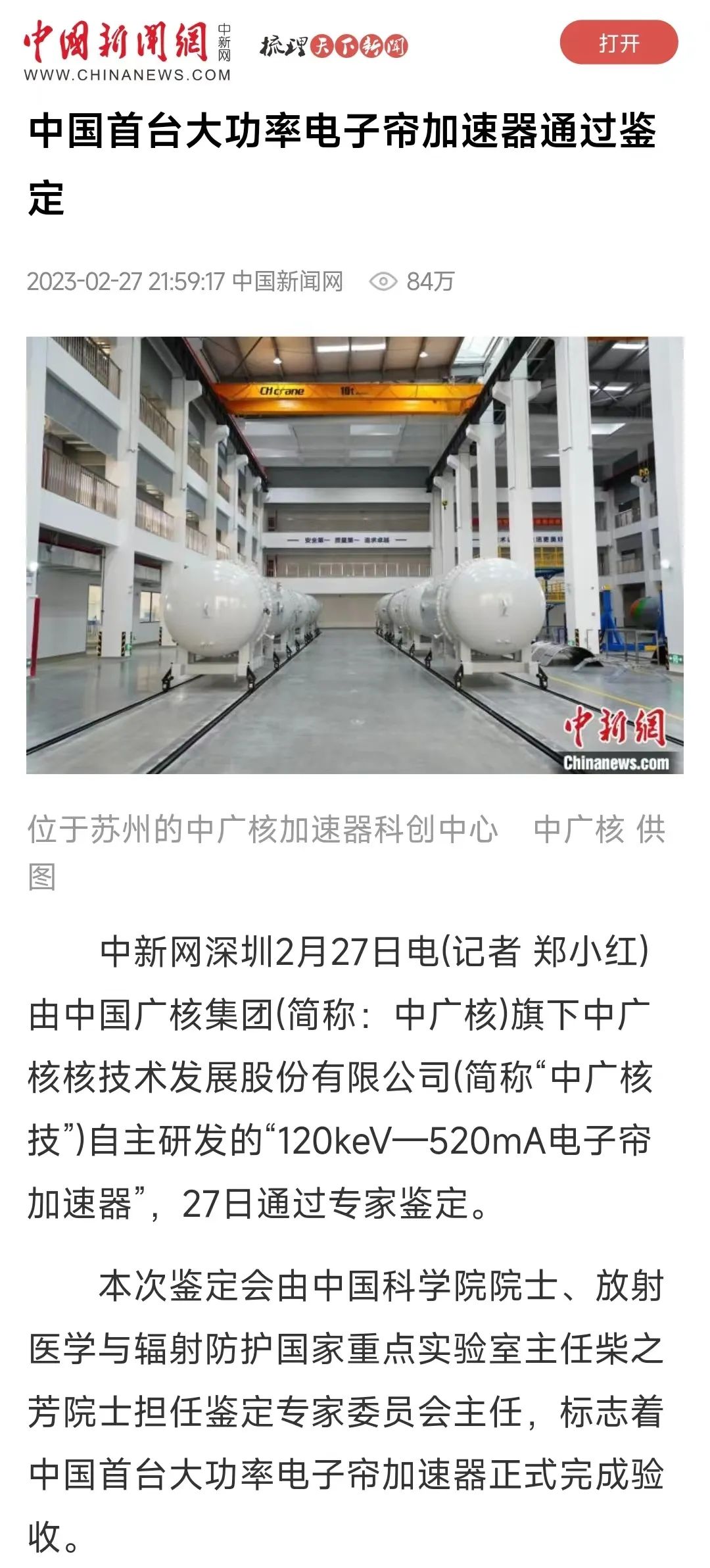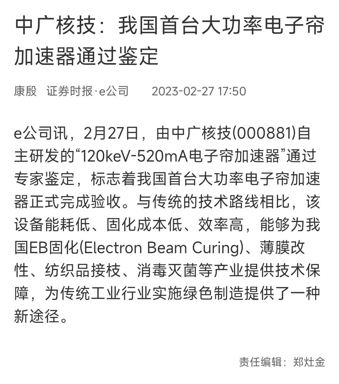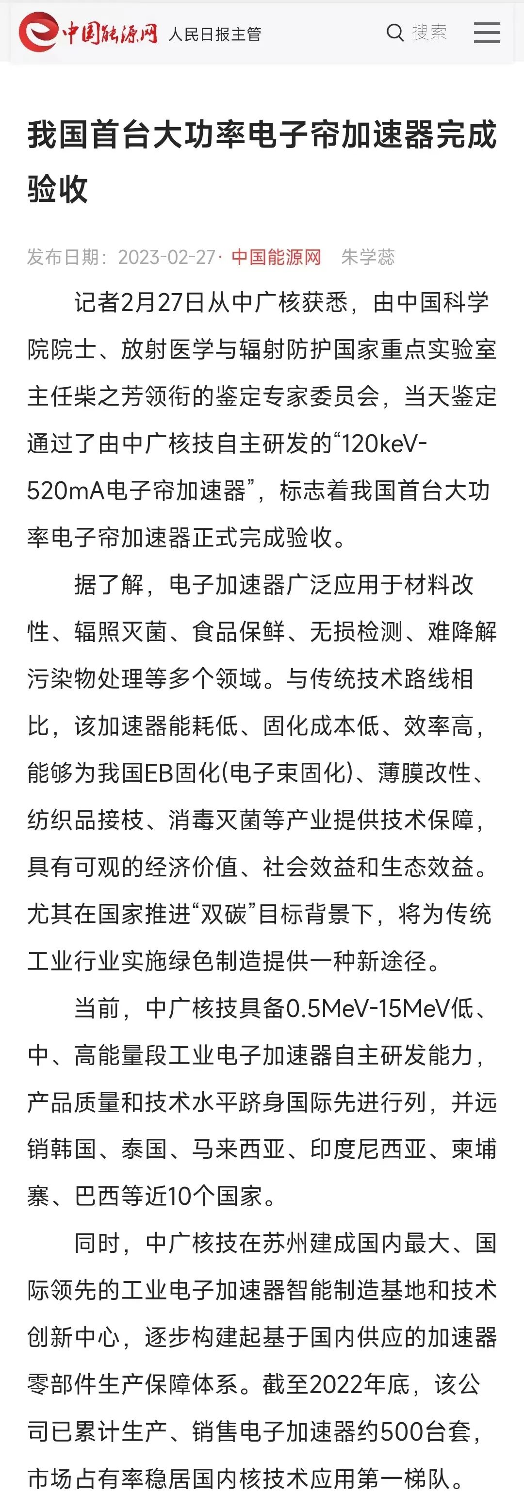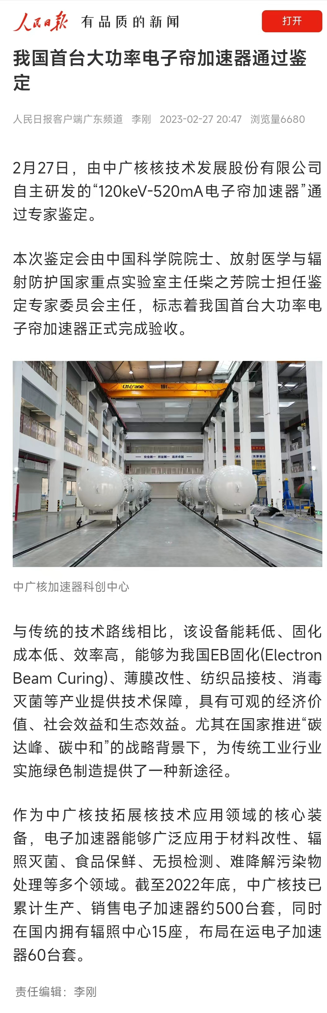 2月27日,由中廣核核技術(shù)發(fā)展股份有限公司(股票代碼:000881.SZ)聯(lián)合中科院近物所研發(fā)的“120keV-520mA電子簾加速器”通過(guò)專(zhuān)家鑒定。本次鑒定會(huì)由同輻行業(yè)協(xié)會(huì)組織,中國(guó)科學(xué)院院士、放射醫(yī)學(xué)與輻射防護(hù)國(guó)家重點(diǎn)實(shí)驗(yàn)室主任柴之芳院士擔(dān)任鑒定專(zhuān)家委員會(huì)主任,標(biāo)志著我國(guó)首臺(tái)大功率電子簾加速器正式完成驗(yàn)收。與傳統(tǒng)的技術(shù)路線相比,該設(shè)備能耗低、固化成本低、效率高,能夠?yàn)槲覈?guó)EB固化(Electron Beam Curing)、薄膜改性、紡織品接枝、消毒滅菌等產(chǎn)業(yè)提供技術(shù)保障,具有可觀的經(jīng)濟(jì)價(jià)值、社會(huì)效益和生態(tài)效益。尤其在我國(guó)推進(jìn)“碳達(dá)峰、碳中和”的戰(zhàn)略背景下,為傳統(tǒng)工業(yè)行業(yè)實(shí)施綠色制造提供了一種新途徑。