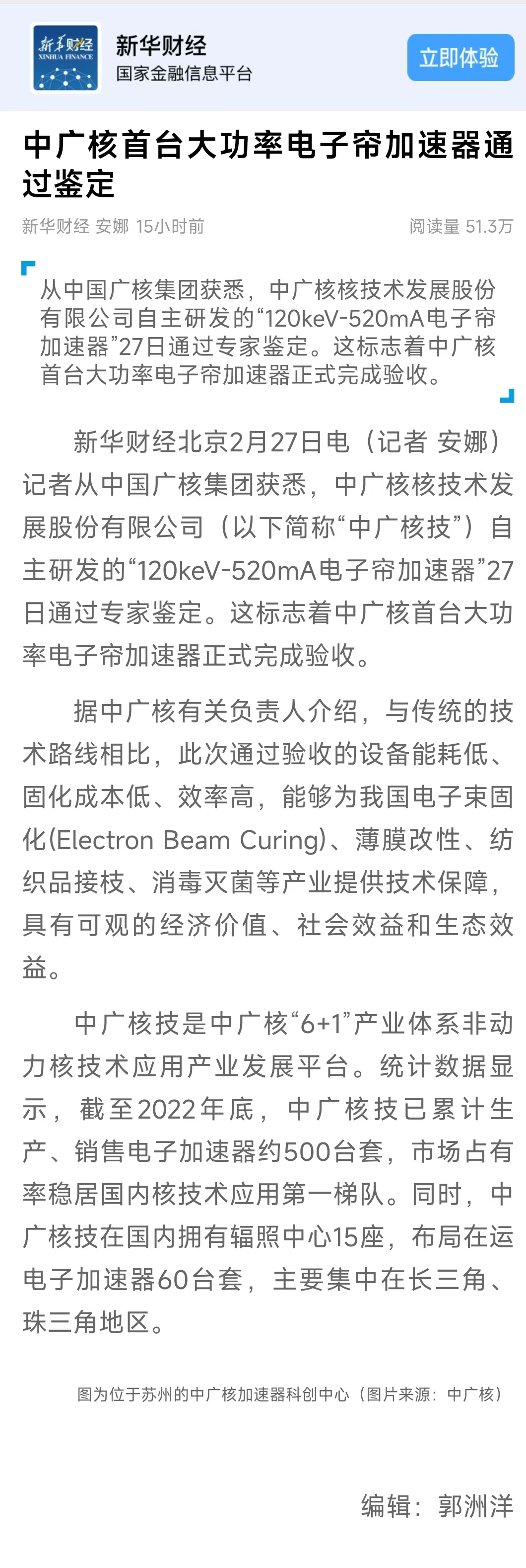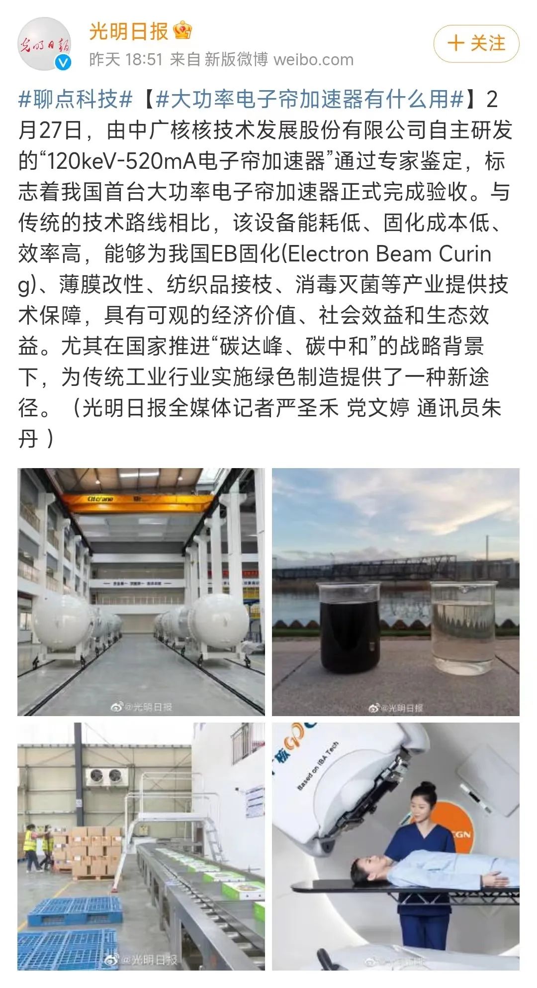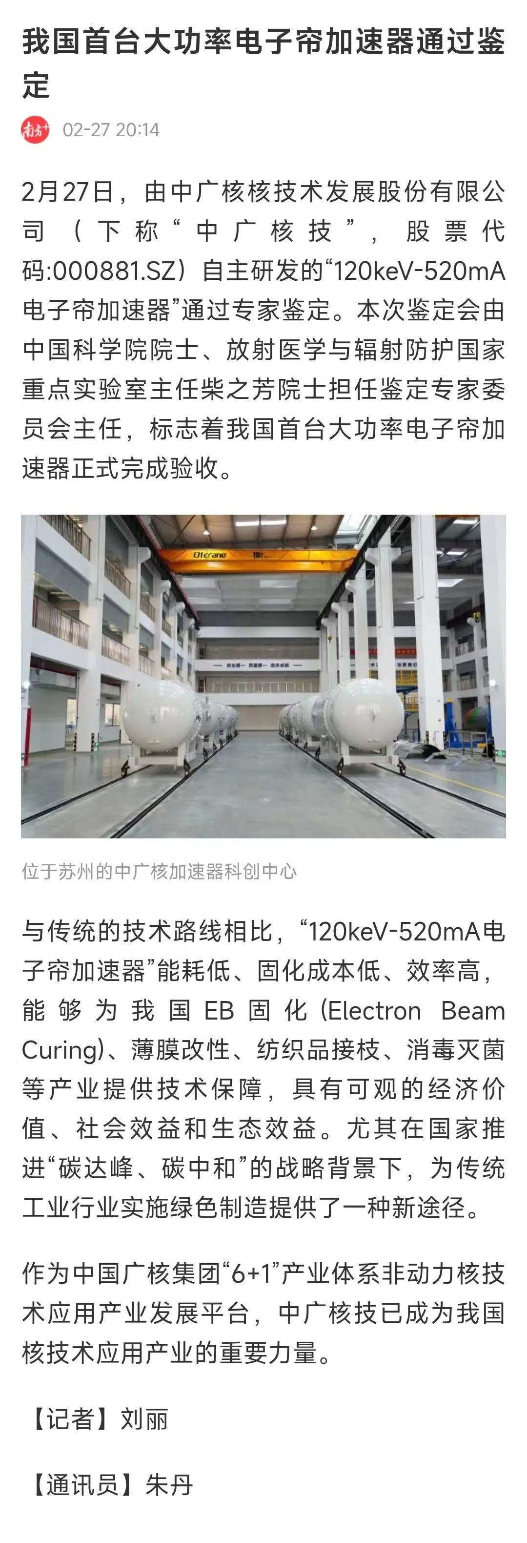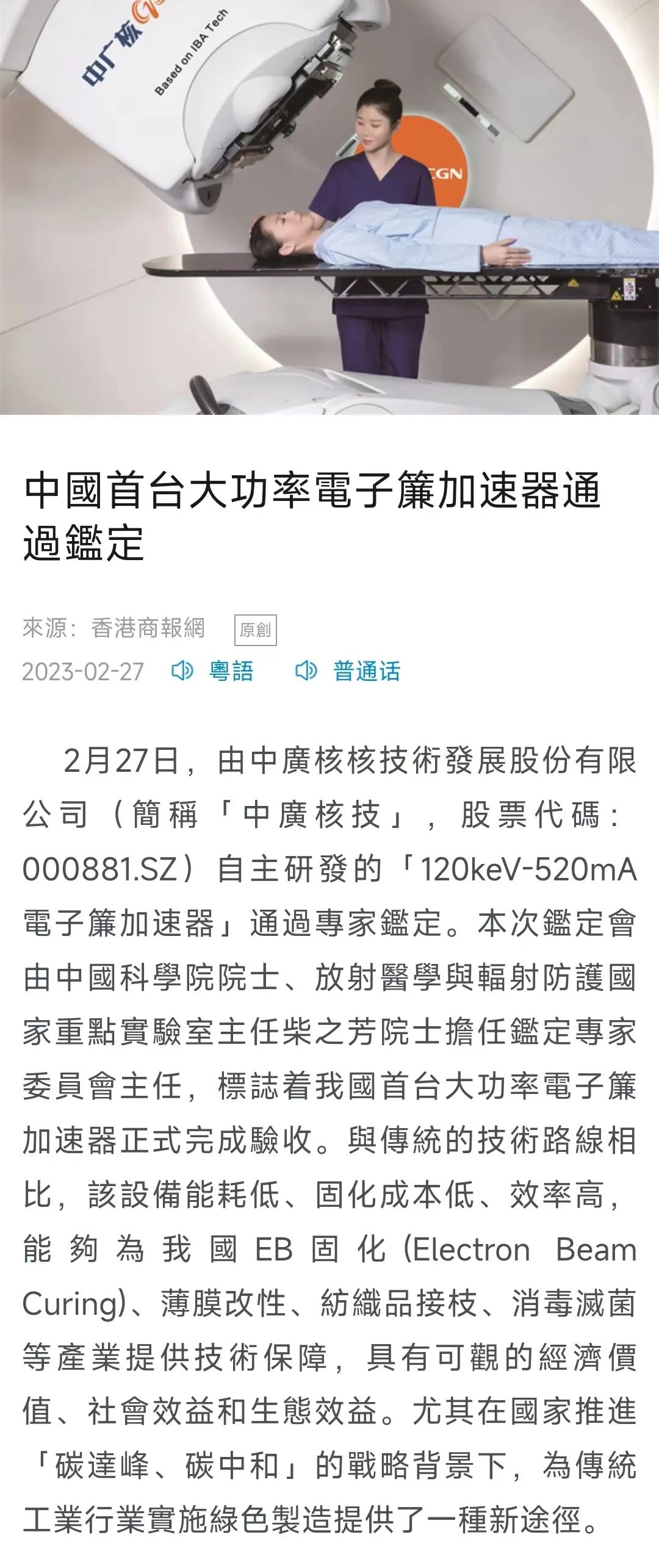 2月27日,由中廣核核技術(shù)發(fā)展股份有限公司(股票代碼:000881.SZ)聯(lián)合中科院近物所研發(fā)的“120keV-520mA電子簾加速器”通過(guò)專(zhuān)家鑒定。本次鑒定會(huì)由同輻行業(yè)協(xié)會(huì)組織,中國(guó)科學(xué)院院士、放射醫(yī)學(xué)與輻射防護(hù)國(guó)家重點(diǎn)實(shí)驗(yàn)室主任柴之芳院士擔(dān)任鑒定專(zhuān)家委員會(huì)主任,標(biāo)志著我國(guó)首臺(tái)大功率電子簾加速器正式完成驗(yàn)收。與傳統(tǒng)的技術(shù)路線相比,該設(shè)備能耗低、固化成本低、效率高,能夠?yàn)槲覈?guó)EB固化(Electron Beam Curing)、薄膜改性、紡織品接枝、消毒滅菌等產(chǎn)業(yè)提供技術(shù)保障,具有可觀的經(jīng)濟(jì)價(jià)值、社會(huì)效益和生態(tài)效益。尤其在我國(guó)推進(jìn)“碳達(dá)峰、碳中和”的戰(zhàn)略背景下,為傳統(tǒng)工業(yè)行業(yè)實(shí)施綠色制造提供了一種新途徑。