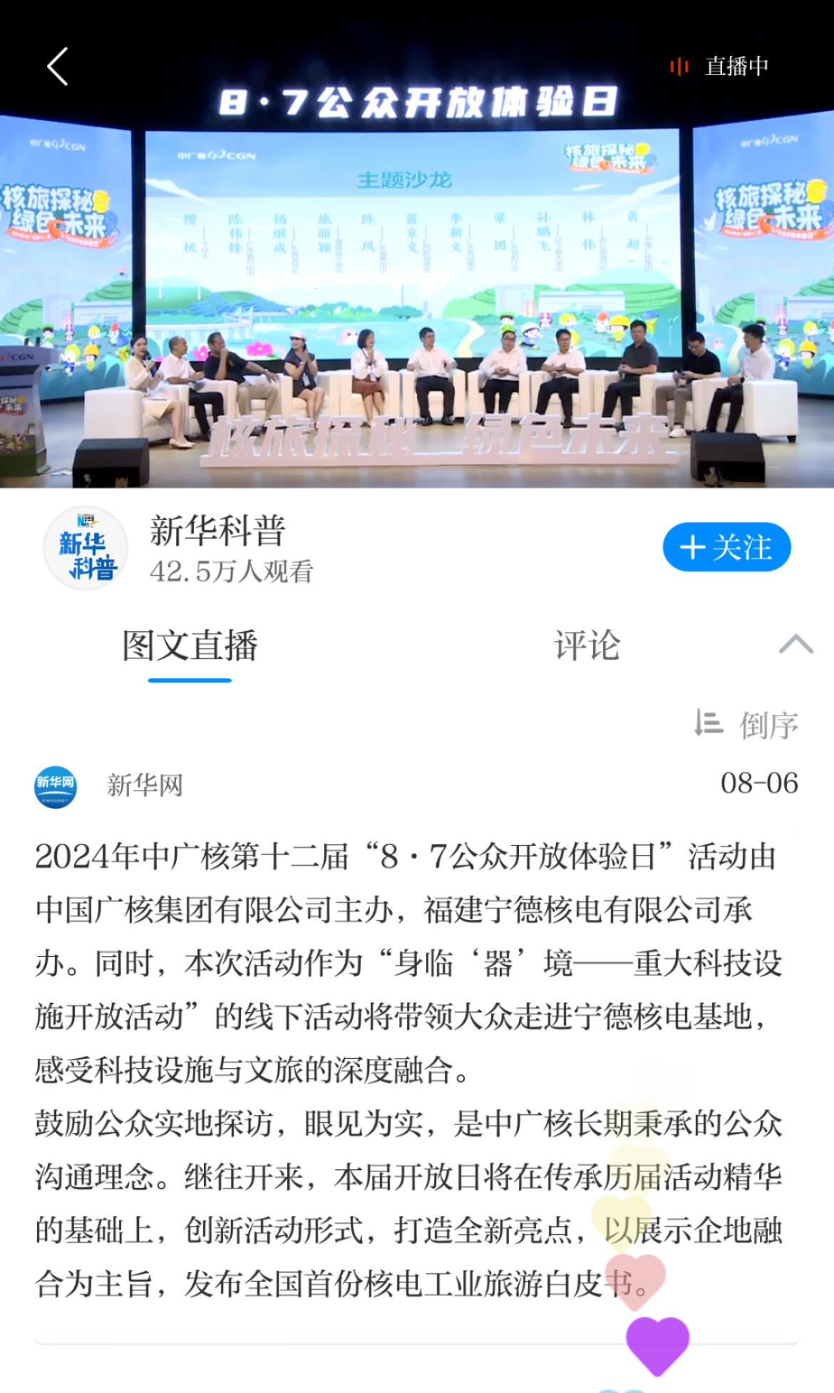 新華網(wǎng)、科技工作者之家、中國科技志愿服務(wù)、新浪廣東、核電那些事,以及中廣核官方微博、抖音、視頻號等多個平臺,對活動情況進(jìn)行現(xiàn)場直播,超135萬人次在線觀看互動。