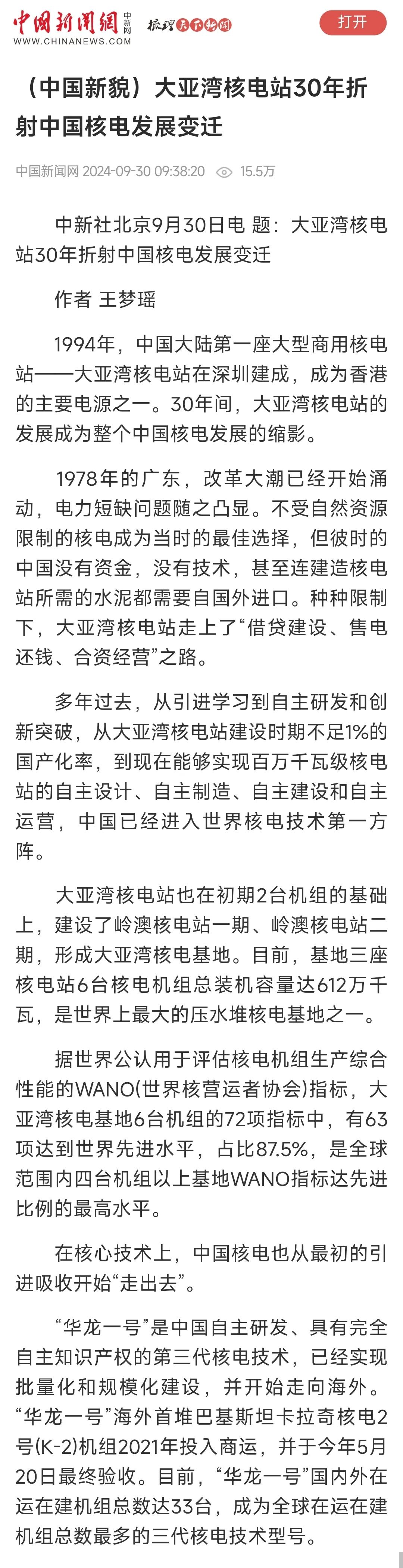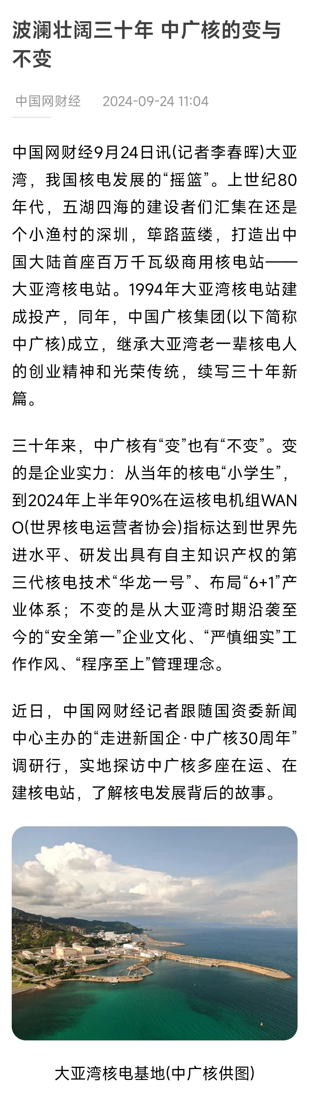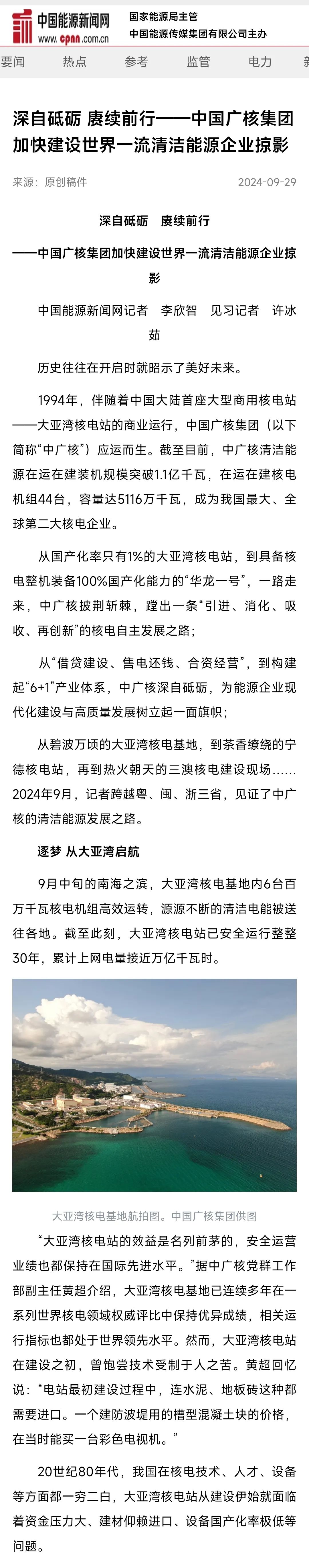 近期,國務(wù)院國資委新聞中心組織開展“走進(jìn)新國企”系列調(diào)研行,20余家媒體記者實地探訪了中廣核大亞灣核電基地、中廣核寧德核電基地、中廣核浙江三澳核電基地、中廣核研究院有限公司南方中心以及中廣核工程有限公司設(shè)計院等地,了解中廣核高質(zhì)量發(fā)展背后的故事。