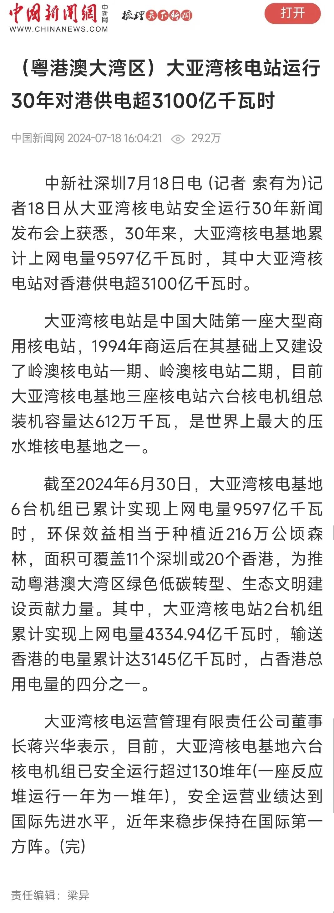 今年,中廣核廣東大亞灣核電站迎來投產(chǎn)三十周年。從大亞灣核電站1994年全面建成以來,大亞灣核電基地累計(jì)上網(wǎng)電量已近1萬億千瓦時(shí),為粵港澳大灣區(qū)的發(fā)展提供了堅(jiān)實(shí)的能源保障。30年的穩(wěn)健發(fā)展使得大亞灣核電站不僅成為了支撐我國(guó)核電強(qiáng)國(guó)夢(mèng)想的關(guān)鍵力量,也成為了改革開放政策下成功發(fā)展的典范。