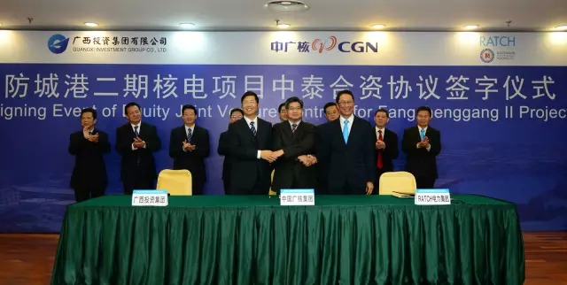 12月23日,中國廣核集團與廣西投資集團有限公司、泰國國家電力公司子公司RATCH在廣西南寧正式簽署了《防城港核電二期項目合資協(xié)議》。根據(jù)協(xié)議,三方將在中泰兩國政府間和平利用核能協(xié)議的基礎上,合資成立防城港核電二期項目公司,共同開發(fā)、建設和運營該項目。